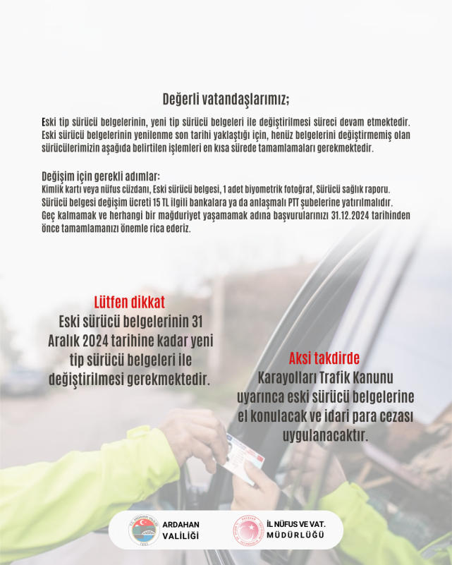 Ardahan Valiliği ve İl Nüfus ve Vatandaşlık Müdürlüğü, eski tip sürücü belgelerinin yeni tip sürücü belgeleri ile değiştirilmesi sürecinin devam ettiğini ve vatandaşların belgelerini en kısa sürede yenilemesi gerektiğini bildirdi. Yapılan duyuruda, değişim sürecinin son tarihinin 31 Aralık 2024 olduğu hatırlatılarak, eski belgelerini yenilemeyen sürücülerin mağduriyet yaşamaması için gerekli adımları atmaları istendi.Değişim İçin Gerekli Belgeler: Kimlik kartı veya nüfus cüzdanı Eski sürücü belgesi 1 adet biyometrik fotoğraf Sürücü sağlık raporu