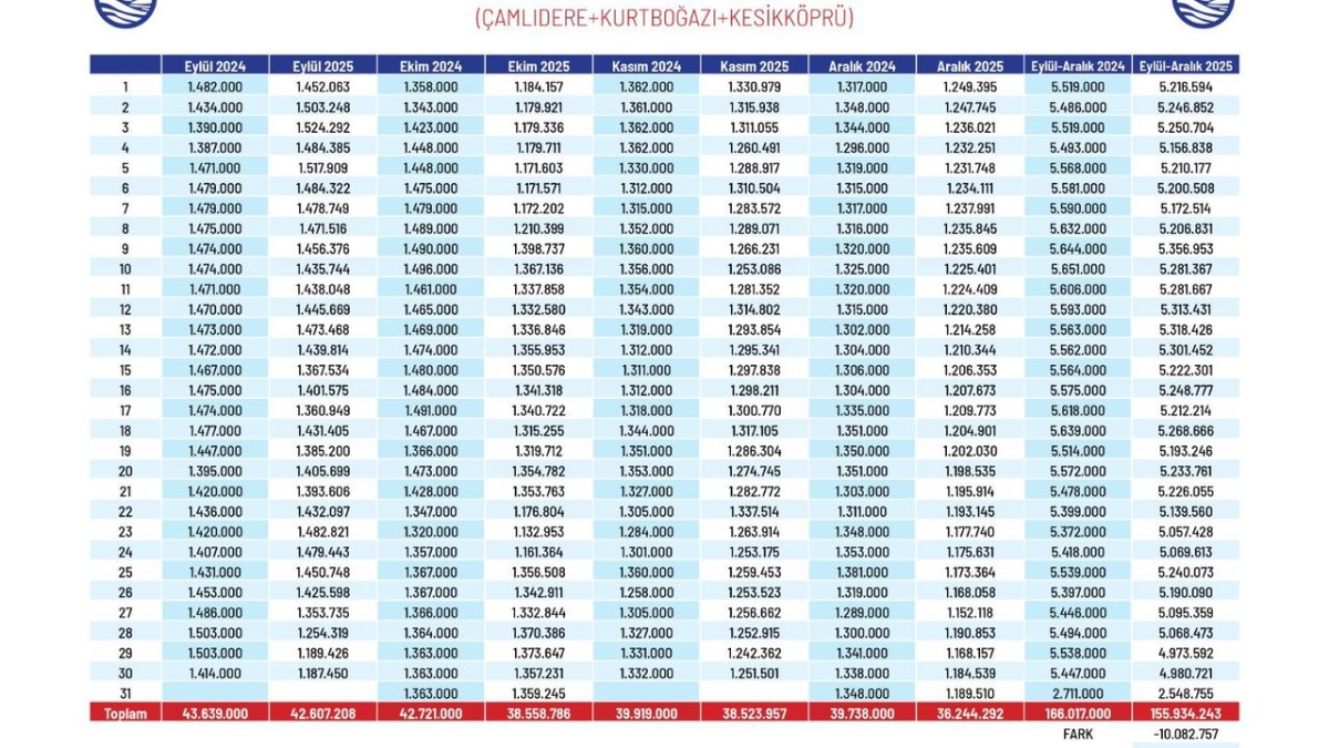 İvedik Arıtma Tesisi'ne gelen ve hanelere dağıtılan su miktarının 2024 ve 2025 yılları arası karşılaştırması ekte bilgilerinize sunulmuştur.