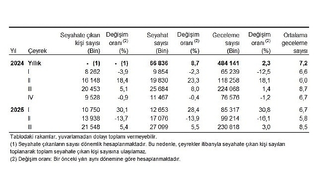 Seyahate çıkan kişi, seyahat ve geceleme sayıları, III. Çeyrek: Temmuz-Eylül, 2025
