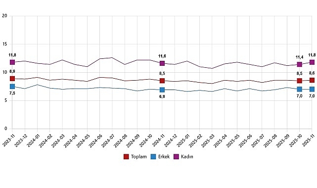 Hanehalkı İşgücü Araştırması sonuçlarına göre; 15 ve daha yukarı yaştaki kişilerde işsiz sayısı 2025 yılı Kasım ayında bir önceki aya göre 54 bin kişi artarak 3 milyon 98 bin kişi oldu. İşsizlik oranı ise 0,1 puan artarak %8,6 seviyesinde gerçekleşti. İşsizlik oranı erkeklerde %7,0 iken kadınlarda %11,8 olarak tahmin edildi.