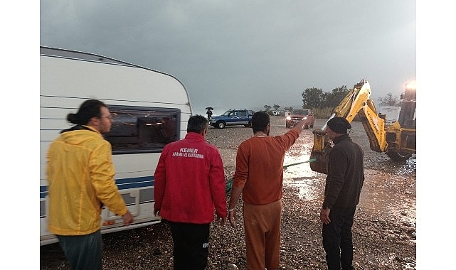 Kemer’de öğle saatlerinde şiddetini, artıran sağanak yağmur sonrası Kemer Belediyesi ekipleri teyakkuza geçti. Ağva deresinin denizle buluştuğu Çamyuva sahilinde karavanlarında mahsur kalan turistleri, Kemer Belediyesi Afet İşleri Müdürlüğü ve Kemer Arama Kurtarma Derneği (KEMKUT) ekipleri, Kemer Belediyesi Fen İşleri Müdürlüğü’ne ait bir kepçe yardımı ile kurtardı.