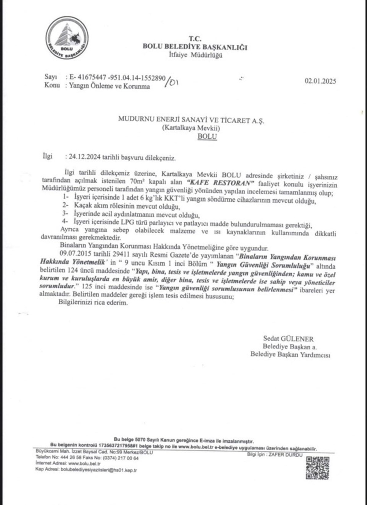 Bolu’daki Kartalkaya Kayak Merkezi’nde bulunan Grand Kartal Otel’de yaşanan yangın felaketine ilişkin soruşturma sürüyor. Yangın felaketine ilişkin gözaltıan alınanların sayısı 11'e çıktı. Yürütülen soruşturma kapsamında son olarak Bolu Belediye Başkan Yardımcısı Sedat Gülener ile İtfaiye Müdür Vekili Kenan Coşkun gözaltına alındı. Sedat Gülener'in 19 gün önce otelin restoranı için verilen uygunluk belgesinde imzası bulunuyor.