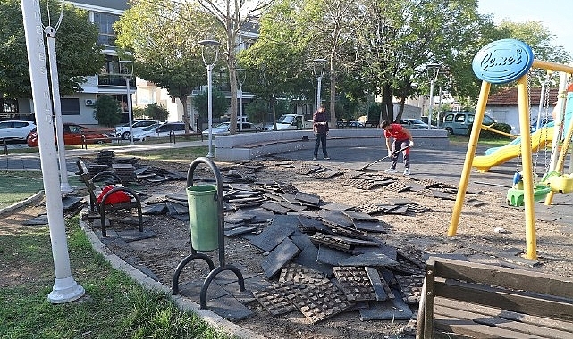 Menderes Belediyesi, çocuk parklarının zemininde yer alan kauçukları yenileme çalışmaları başlattı.