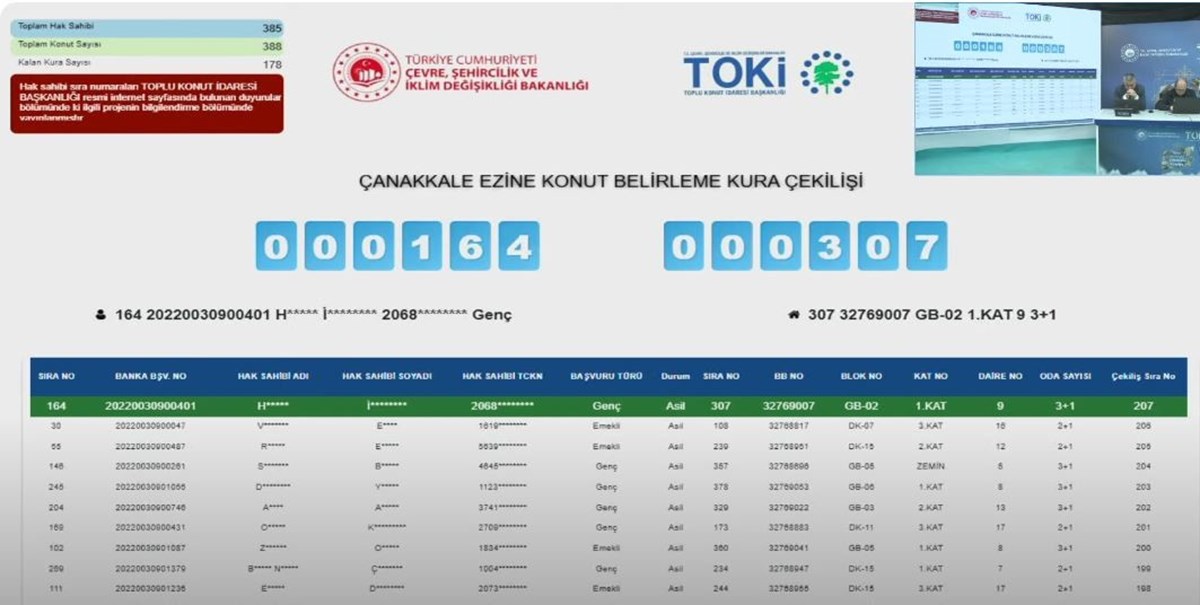 Toplu Konut İdaresi Başkanlığı (TOKİ) tarafından Çanakkale’nin Ezine ilçesinde yürütülen 250 Bin Sosyal Konut Projesi kapsamında inşa edilen 388 konut ve 12 dükkan için kura çekimi gerçekleştirildi.