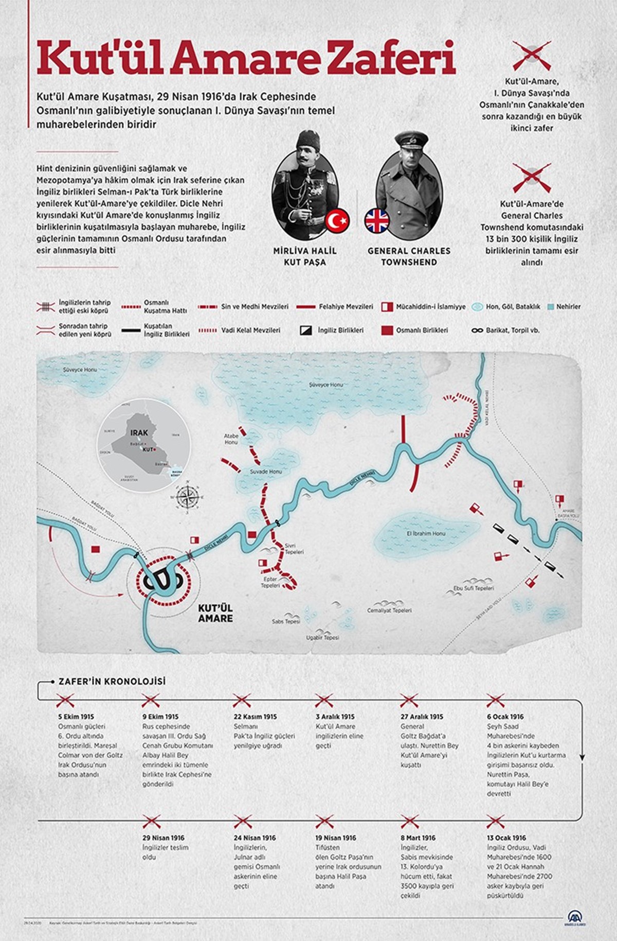 Halil Paşa'nın, İngiliz birliklerini 29 Nisan 1916'da teslim almasının ardından, "Tarih bu olayı yazmak için kelime bulmakta müşkülata uğrayacaktır. İşte Osmanlı sebatının İngiliz inadını kırdığı birinci zaferi Çanakkale'de, ikinci zaferi burada görüyoruz" sözleriyle duyurduğu Kut'ül Amare Zaferi'nin 109'uncu yıl dönümü kutlanıyor. Irak Cephesi'nde 29 Nisan 1916'da Türk ordusunun kesin zaferiyle sonuçlanan Kut'ül Amare Savaşı, Birinci Dünya Savaşı'nın temel muharebelerinden biri olarak kabul ediliyor. Tümgeneral Charles Vere Ferrers Townshend komutasındaki İngiliz birliklerinin teslim alınmasıyla kazanılan bu zafer, Çanakkale'nin ardından Birinci Dünya Savaşı'nın "en büyük zaferi" olma niteliği taşıyor.