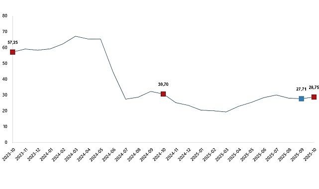 YD-ÜFE 2025 yılı Ekim ayında bir önceki aya göre %0,90 artış, bir önceki yılın Aralık ayına göre %28,69 artış, bir önceki yılın aynı ayına göre %28,75 artış ve on iki aylık ortalamalara göre %25,13 artış gösterdi.